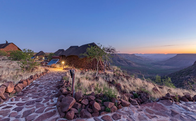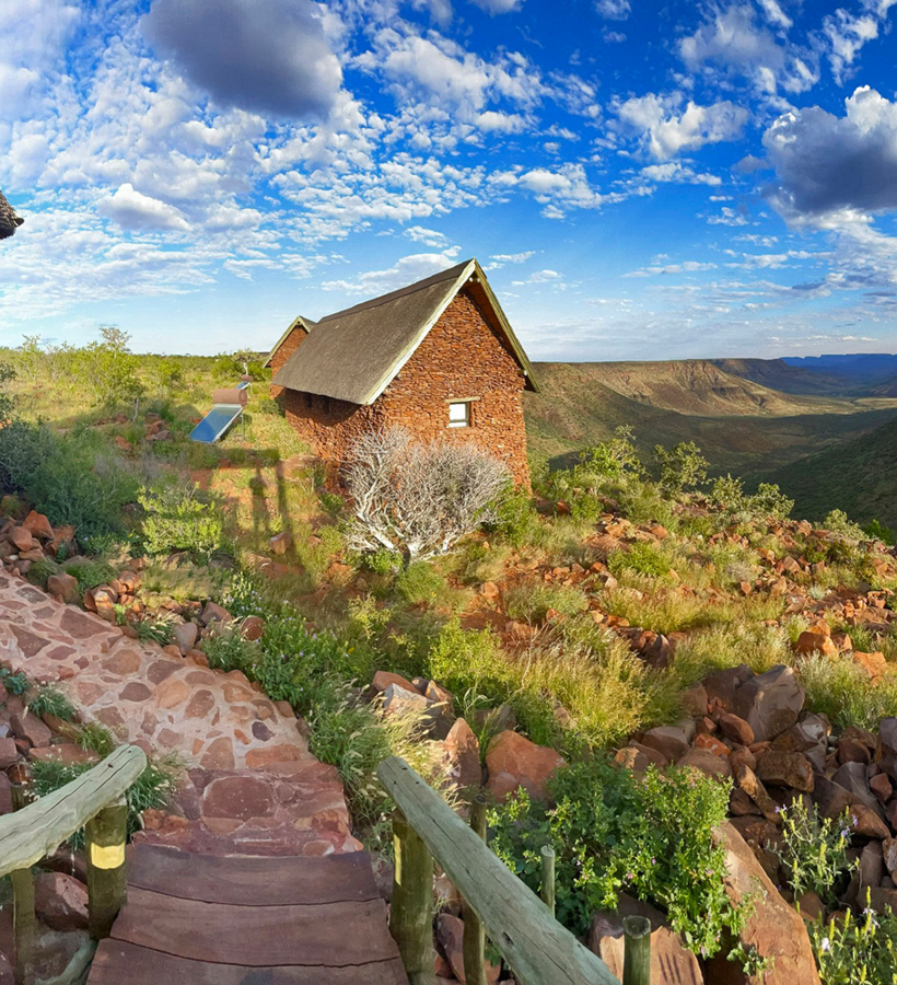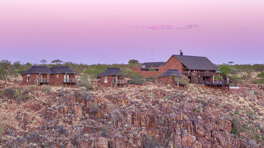Die Stein- und Reetdachchalets der Lodge fügen sich harmonisch in die Landschaft ein und verfügen über private Terrassen, komfortable Einrichtung und alle wichtigen Annehmlichkeiten. Gäste können sich im Haupthaus entspannen, das ein Restaurant, eine Bar, einen Pool und gemütliche Lounges mit Panoramablick bietet. Vollständig mit Solarenergie betrieben und auf Wassereinsparung ausgerichtet, ist die Grootberg Lodge ein Modell für nachhaltigen Tourismus – sie bietet Komfort, Ruhe und eine tiefe Verbindung zur Natur. Bitte beachten Sie, dass das Fliegen von Drohnen in diesem Gebiet streng verboten ist.